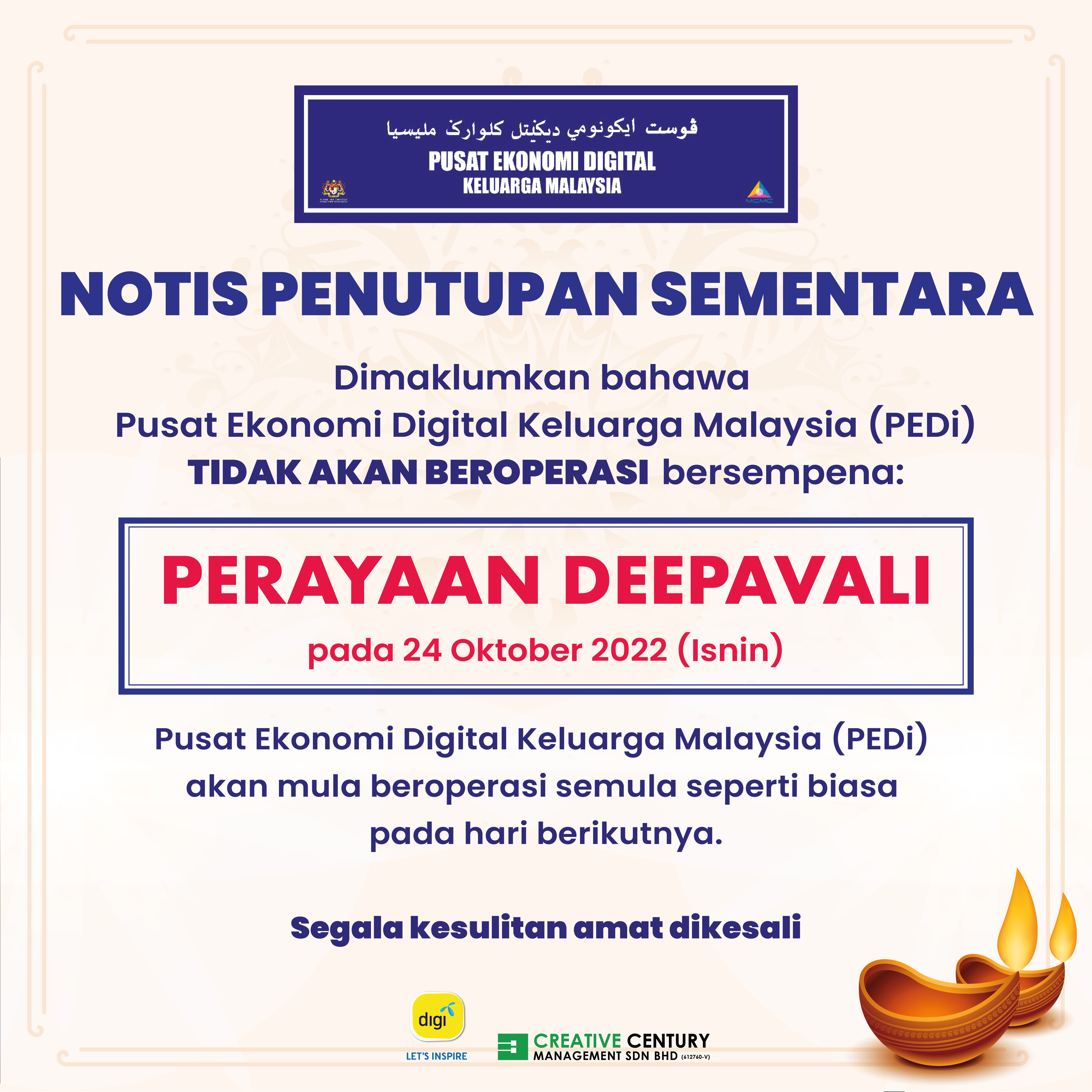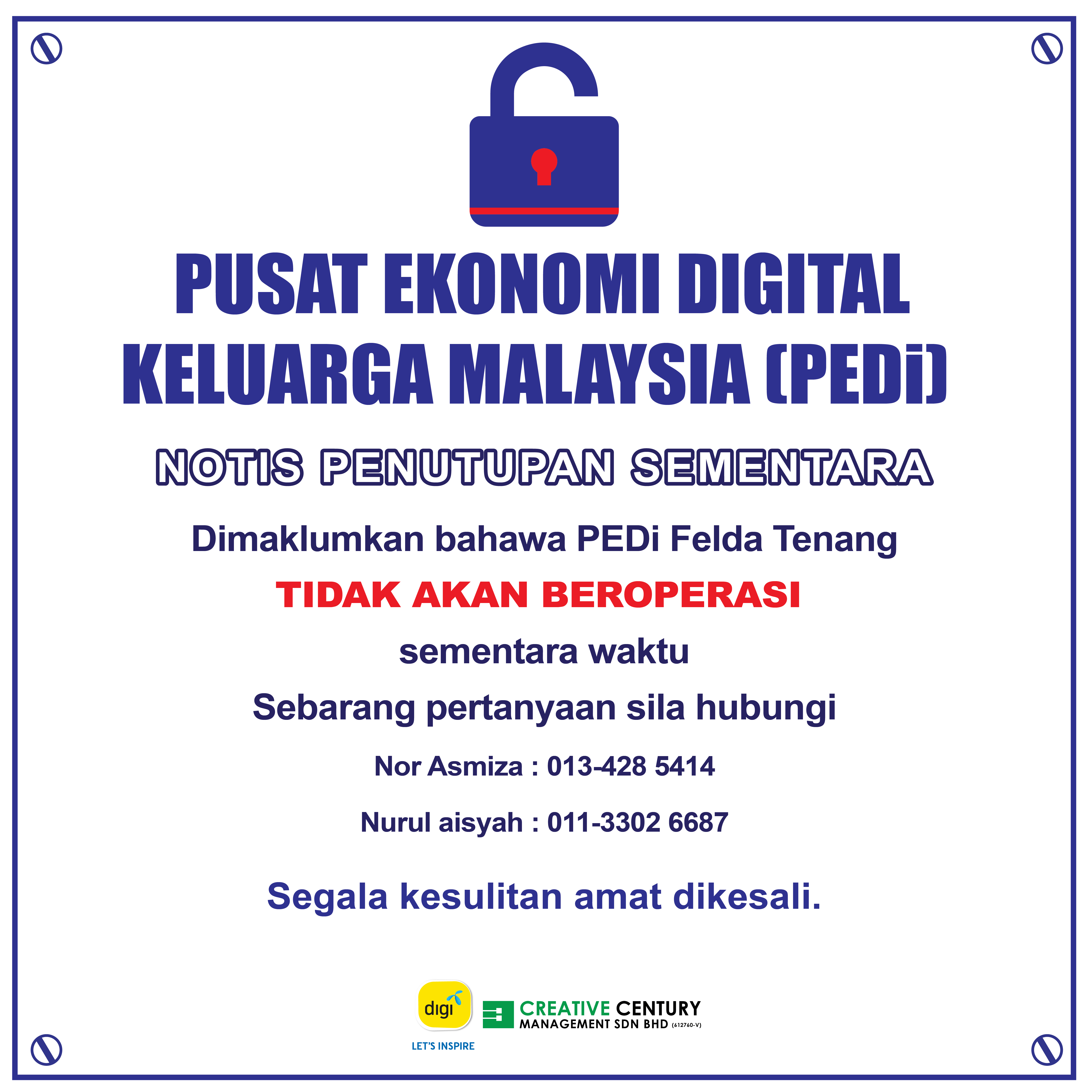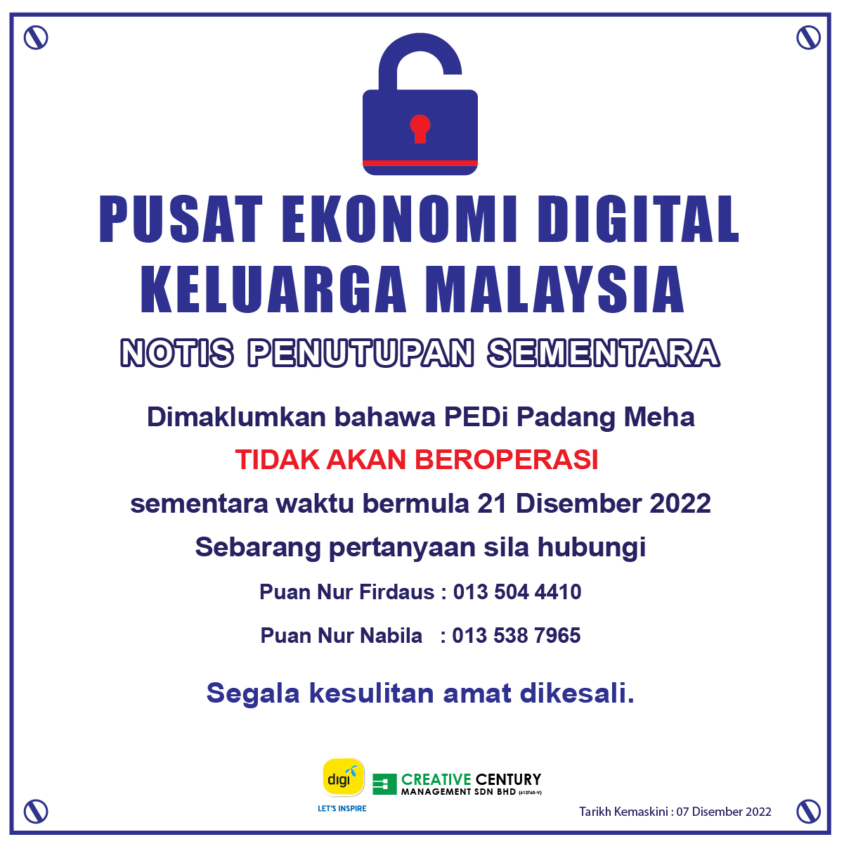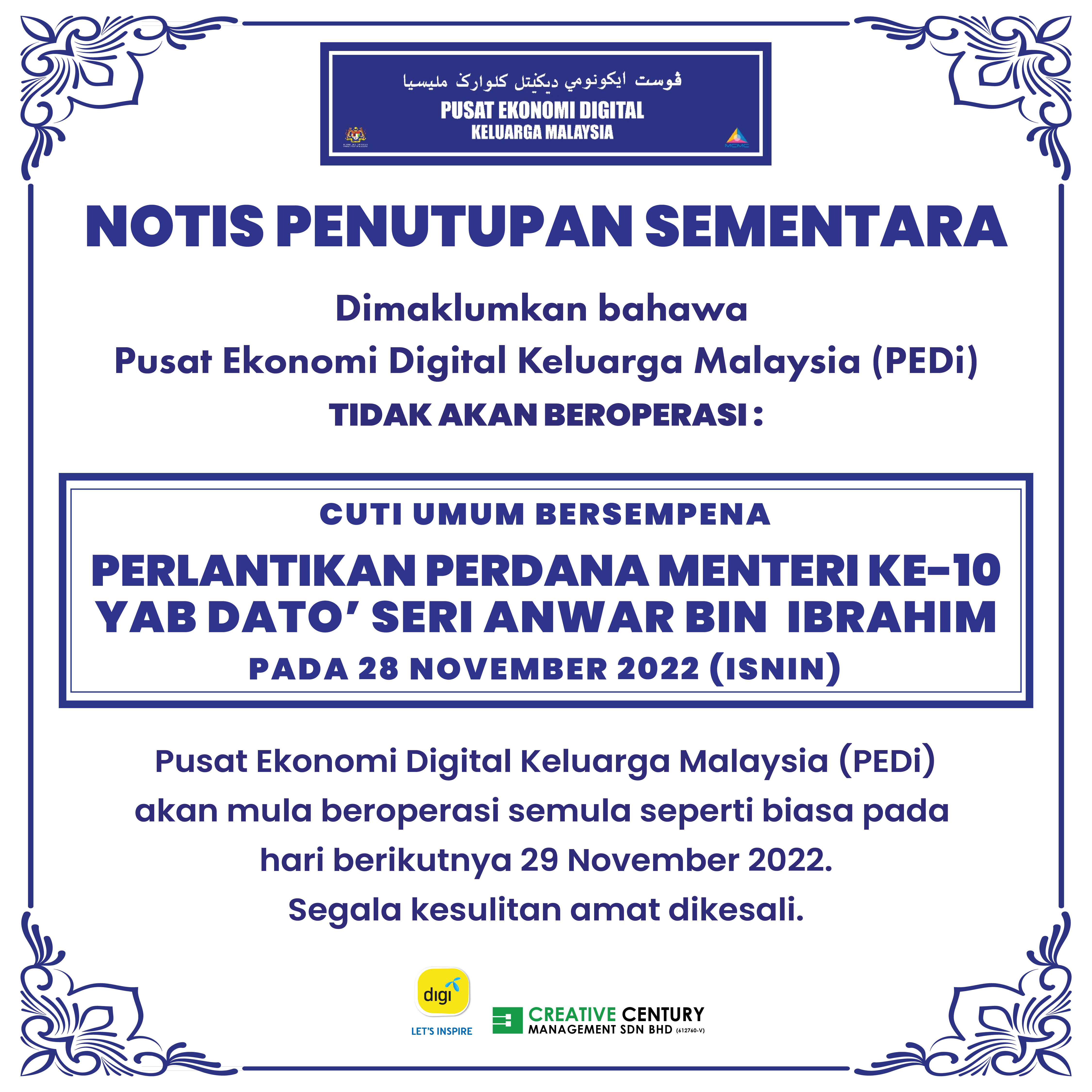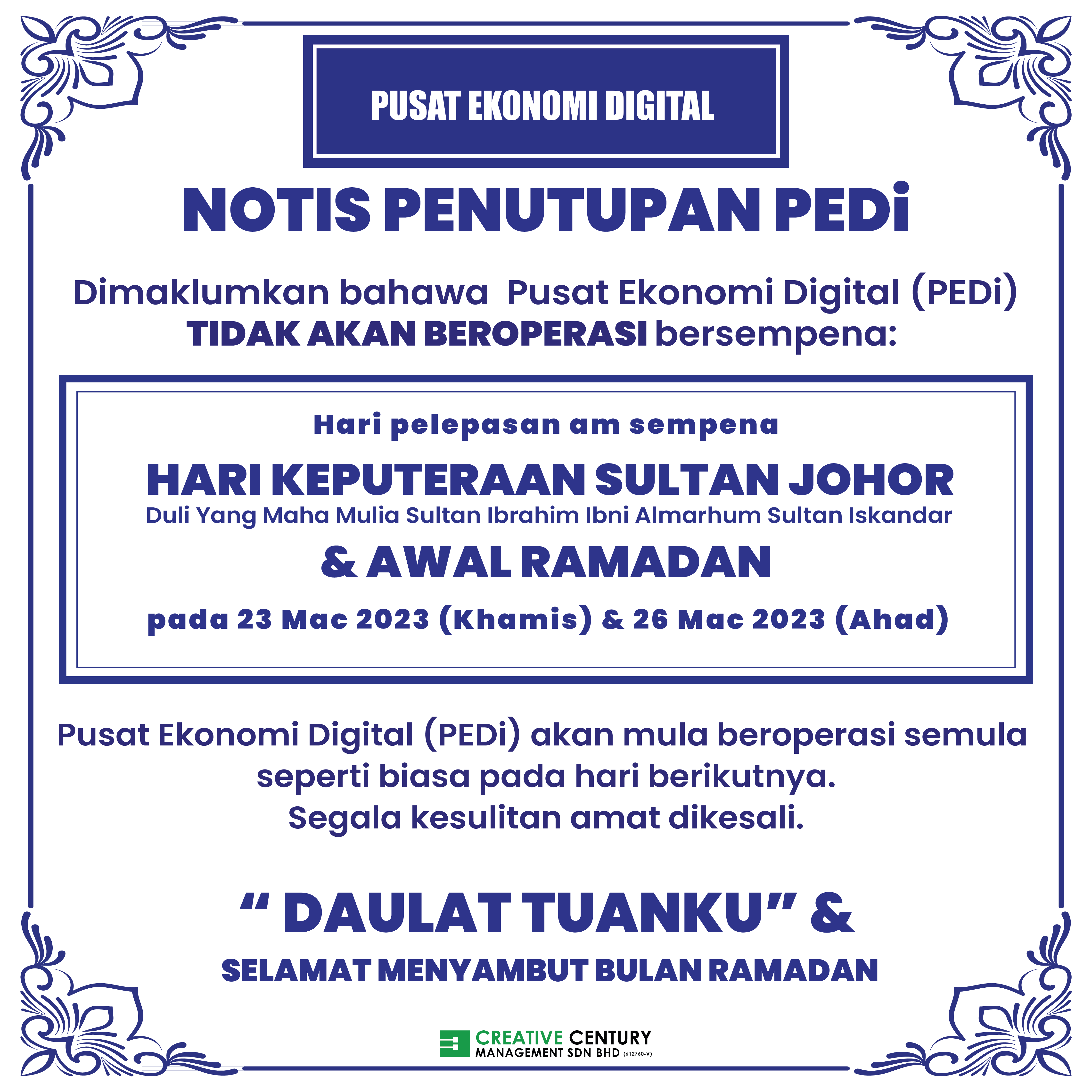 Dimaklumkan bahawa Pusat Ekonomi Digital Keluarga Malaysia (PEDi) bagi negeri Johor akan di tutup sementara bersempena Cuti Pertistiwa susulan kejayaan pasukan Johor Darul Takzim melangkah ke perlawanan akhir Piala Malaysia dan Cuti Umum Pelantikan Perdana Menteri ke-10 pada 27 dan 28 November 2022 (Ahad & Isnin).