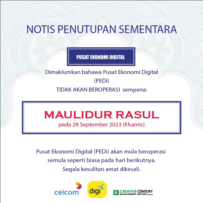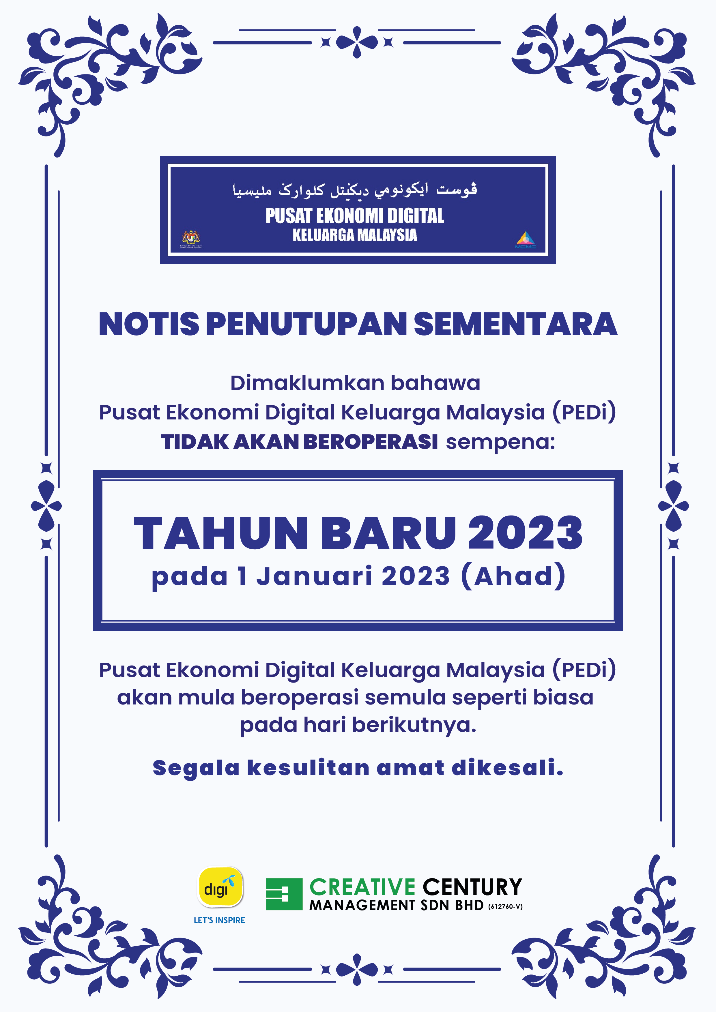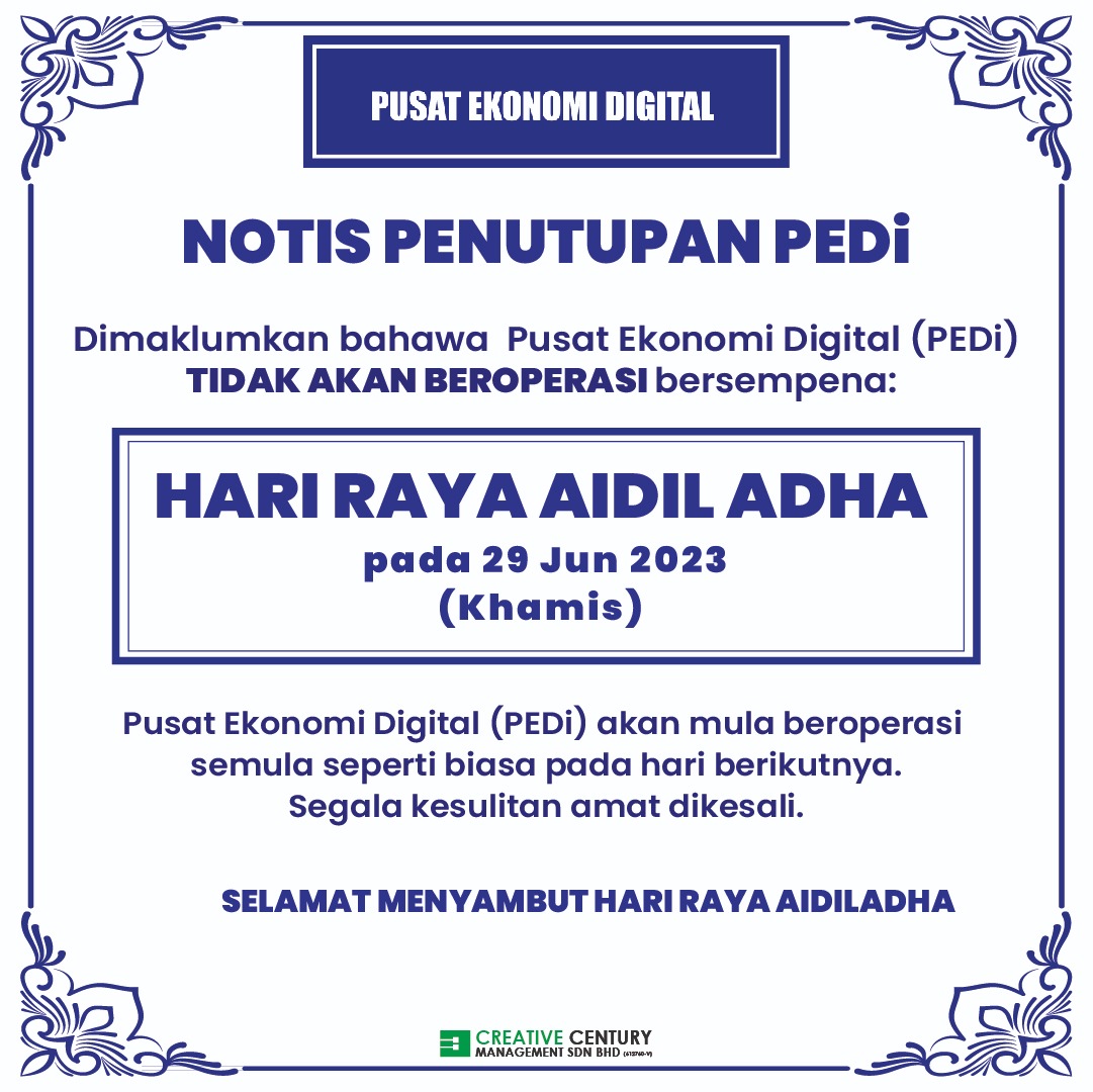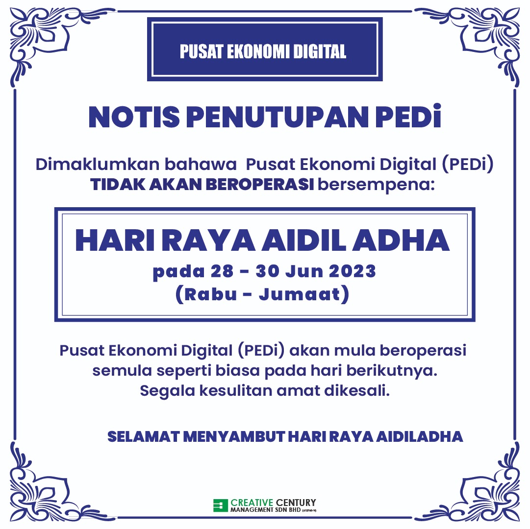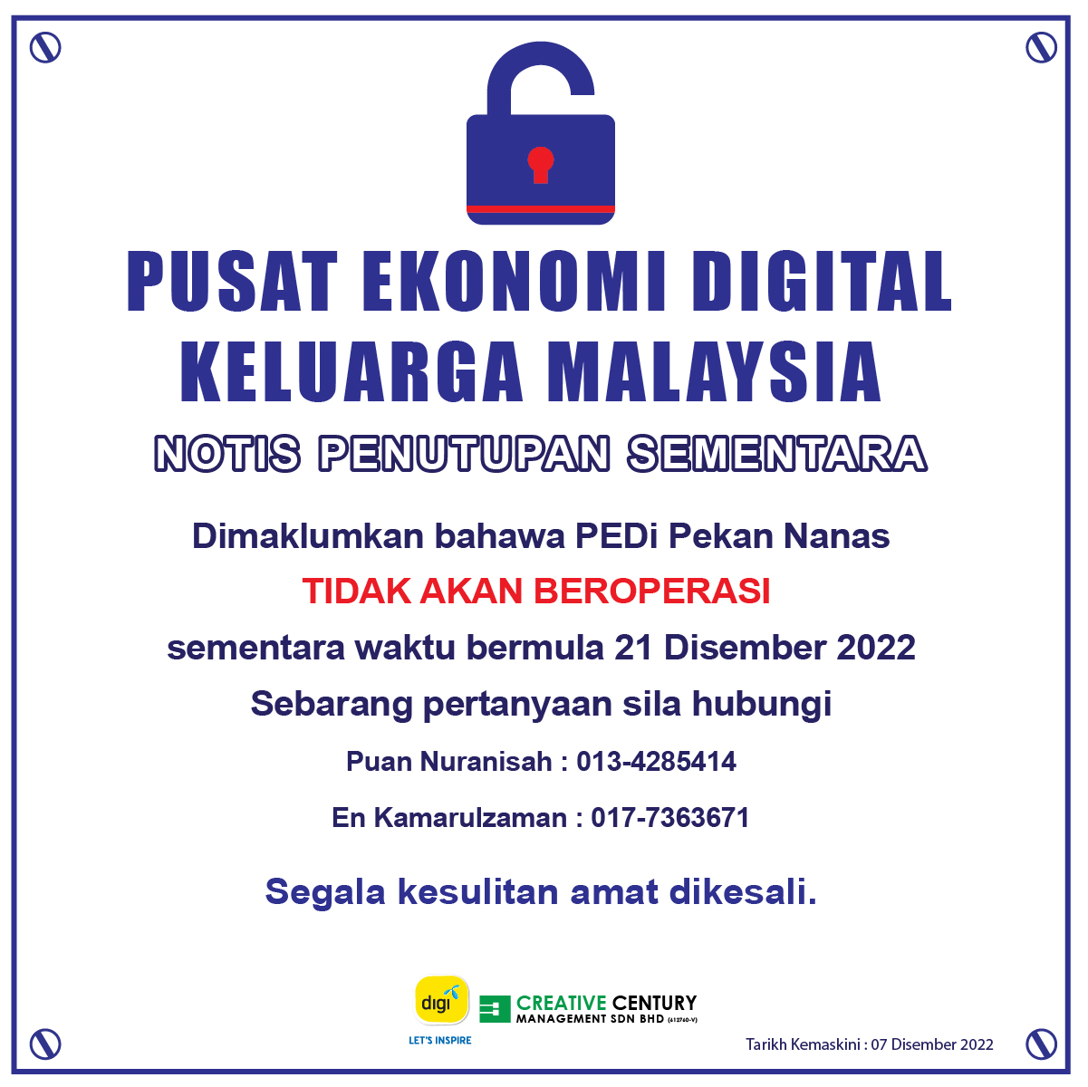 Dimaklumkan bahawa Pusat Ekonomi Digital Keluarga Malaysia (PEDi) bagi negeri Johor akan di tutup sementara bersempena Cuti Pertistiwa susulan kejayaan pasukan Johor Darul Takzim melangkah ke perlawanan akhir Piala Malaysia dan Cuti Umum Pelantikan Perdana Menteri ke-10 pada 27 dan 28 November 2022 (Ahad & Isnin).